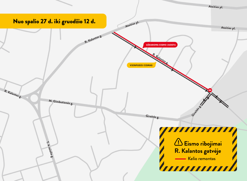 Rangovai darbus pradės nuo atkarpos tarp Ateities plento ir Giraitės gatvės – keisis eismo organizavimo tvarka. Nuo pirmadienio iki gruodžio vidurio minėtoje atkarpoje dėl uždaromos vienos juostos laikinai numatomas vienpusis eismas – kryptis Kauno marių link.